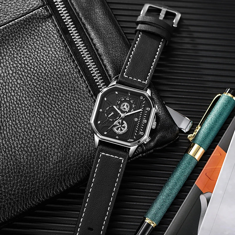 A square dial with intricate detailing anchors this bold timepiece, crafted with a durable metal case and hand-stitched leather band. Quartz movement ensures precise timekeeping with a refined edge.