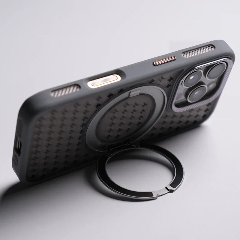 Built with shock-resistant polycarbonate and TPU, this slim iPhone case offers lightweight protection with a secure, non-slip grip. A rotating stand adds convenience for hands-free use.
