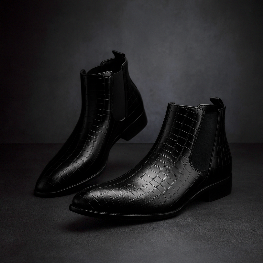 Crafted from textured leather with a snakeskin finish, these Chelsea boots command attention with understated confidence. The cushioned insole and easy slip-on design bring all-day comfort to modern sophistication.